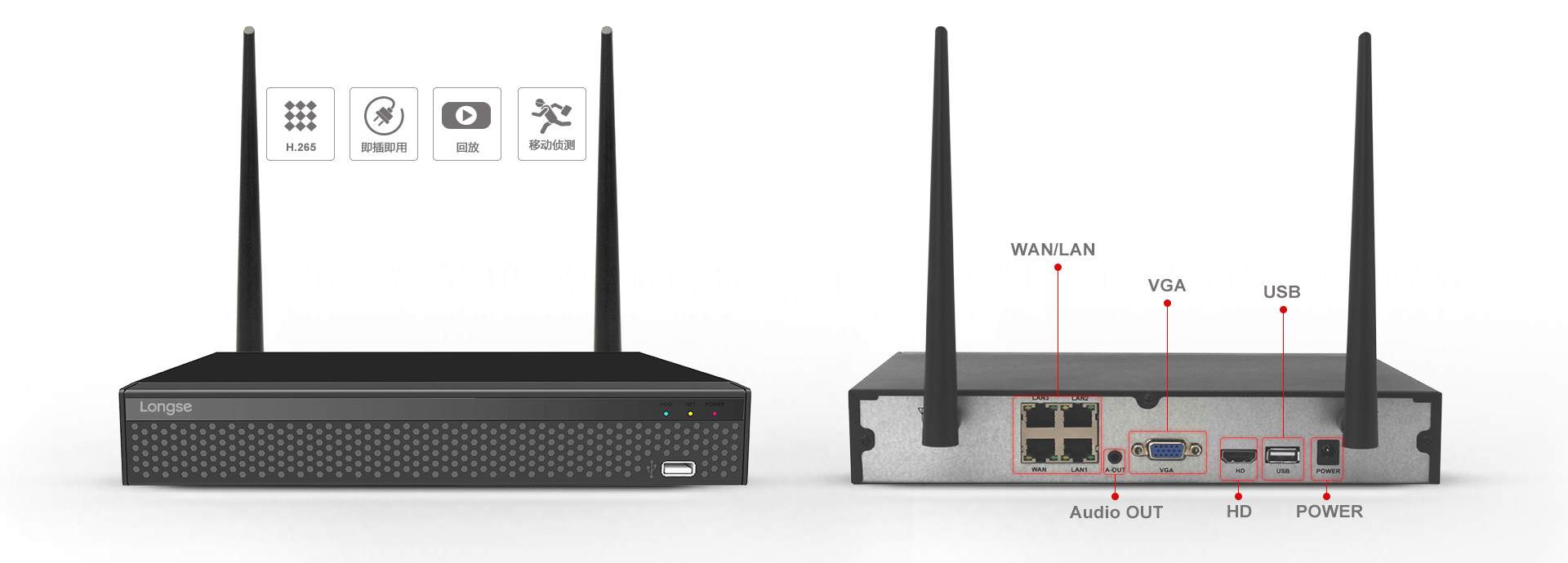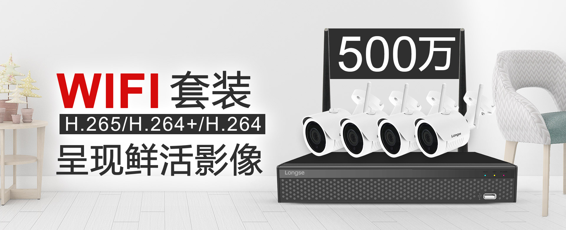 长视500万 WIFI监控套装具有的即插即勤奋能,以简化流程为目标,接通摄像机和录相机的电源,
